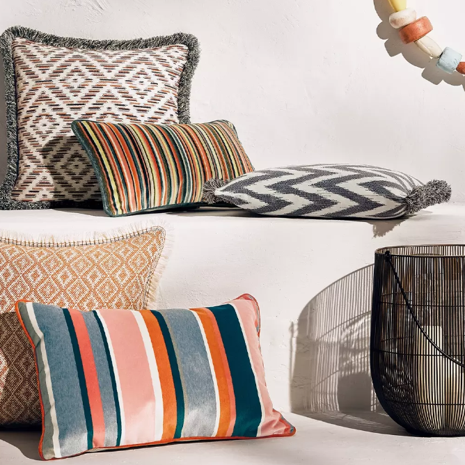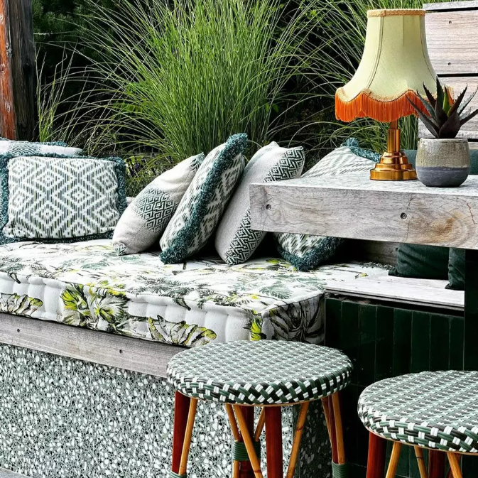 Create an Outdoor Gallery: Use artistic geometric weaves for custom cushions and and seat pads for your sunken fire-pit seating.